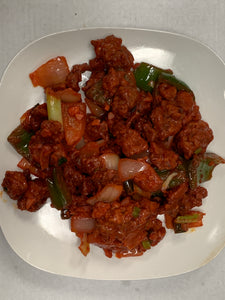 Boneless chicken pieces are marinated in soya sauce, chili sauce and black pepper. Later coated with cornstarch, flour and egg white, before frying to yield crispy chicken. Then tossed in a sauce made of chilli, garlic, and yogurt along with onion and bell peppers